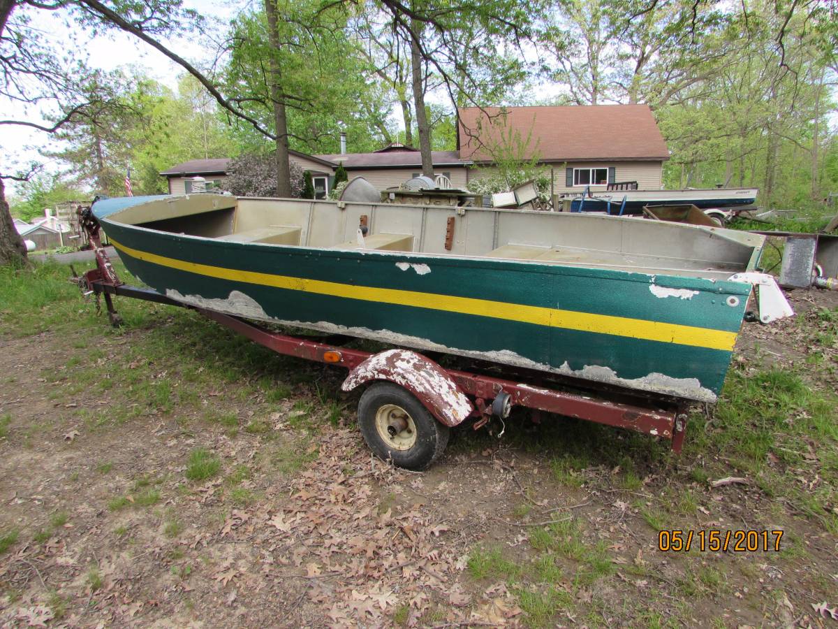 This is a cool classic 1957 AeroCraft. There is no damage to the boat, it would look great restored or use it for everyday fishing, the green paint will powerwash off. It is 16' long.