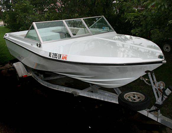 1974 Browning AeroCraft Monte Carlo, 18', fiberglass, 350 Oldsmobile Rocket Motor. This boat is a classic. If you ever priced an Olds Rocket Motor you know this boat is a steal. The good news is she had a total redo in 2006. Engine ran strong and she handles like a big jet ski for 4 people. At slow plane she burns only 4 1/2 gallons per hour. Top speed was clocked by gps at 51mph but I think she can go faster with a little adjustment. You can take her into shallow waters where other boats don't dare and you don't have to worry about a prop striking submerged logs. Comes with trailer, stereo / cd player, running lights and anchor. Ready for day or night rides. There are two problems that are easily fixed but I just don't have the time. The steering cable needs to be oiled or replaced and one cylinder has low compression so the head gasket needs to be replaced.